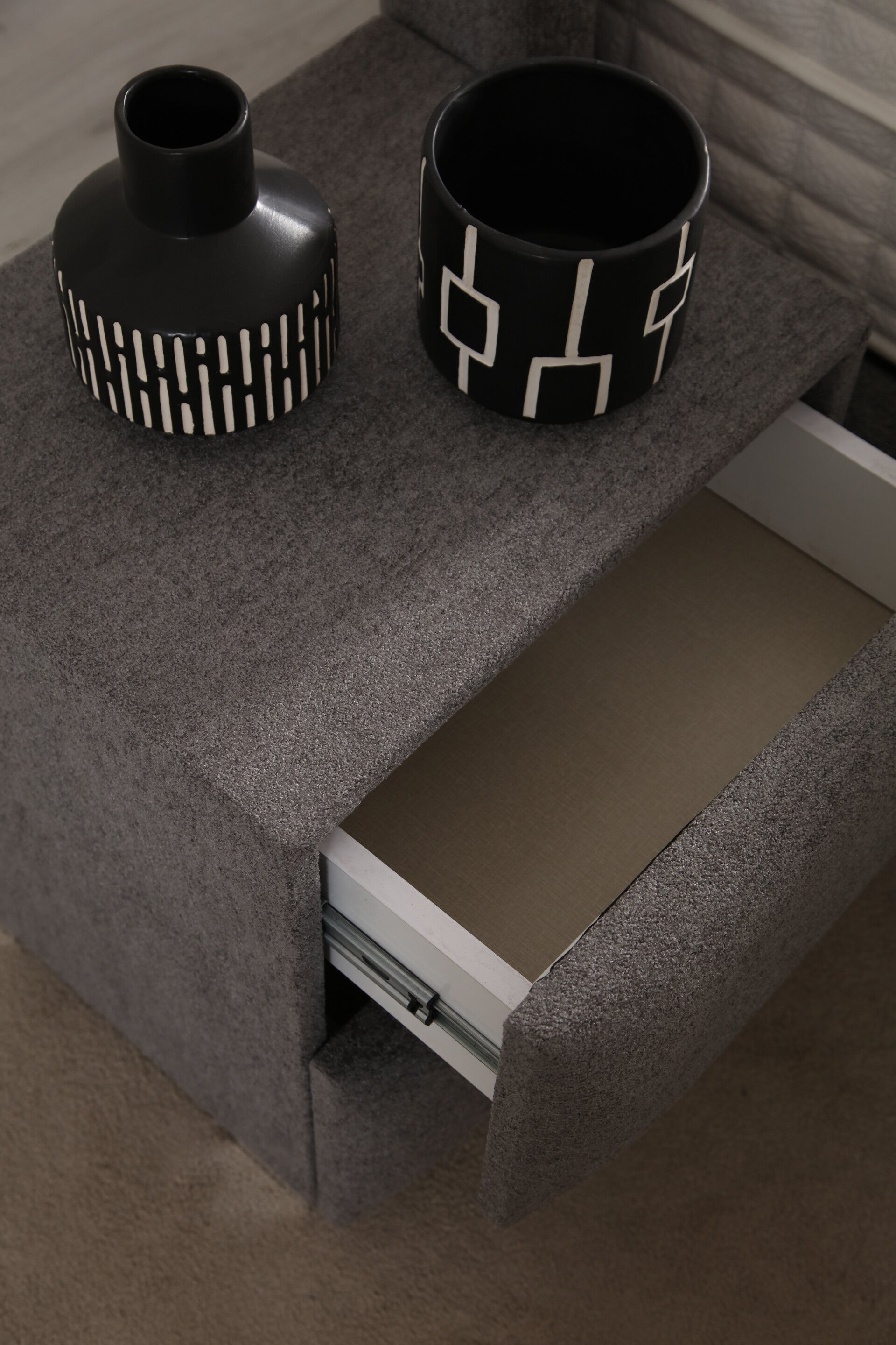 Son revêtement en chenille luxueux offre un style raffiné, tandis que son grand espace de rangement dissimulé vous permet de garder une chambre toujours ordonnée.
