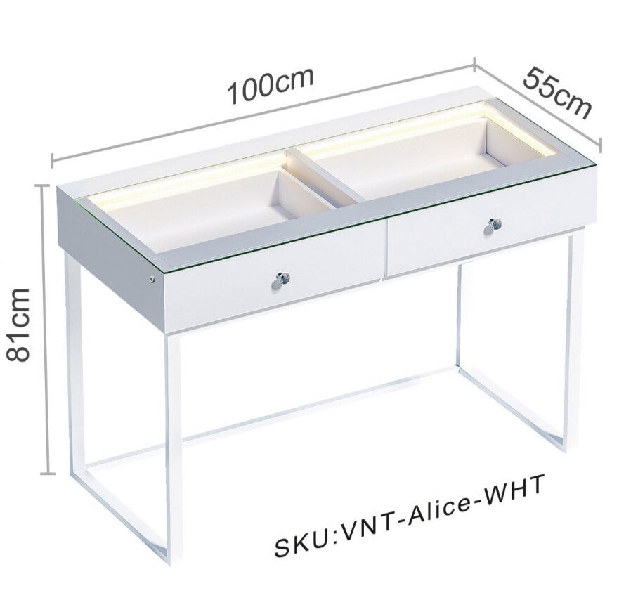 Infos s u r l e produit• 2 tiroirs de rangement avec poignées e n cristal• Bande lumineuse intégrée sur le bureau• Luminosité réglable• Montage e t installation faciles